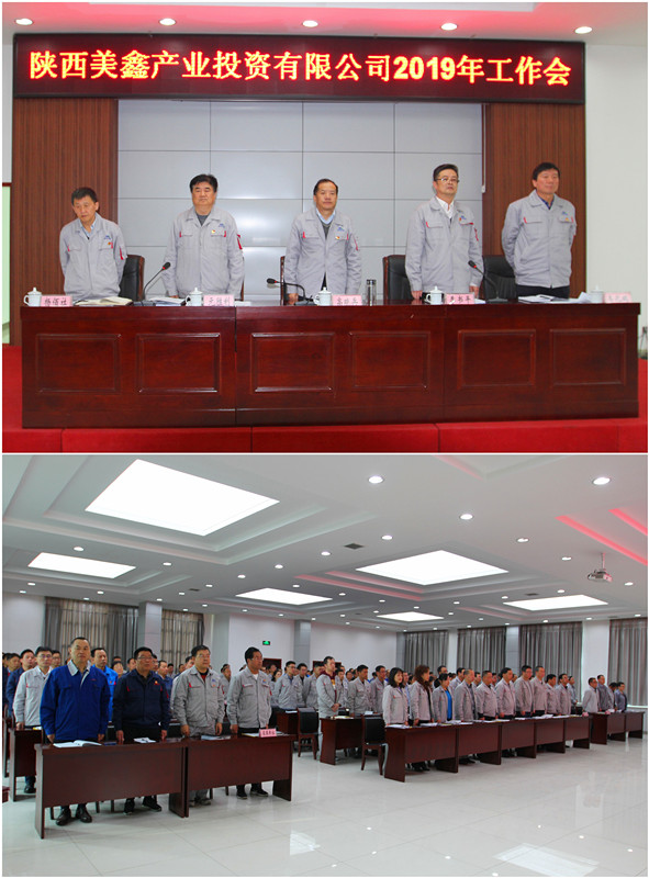 追趕超越奮進新時代,擔當實干展現新作為。4月3日上午,公司在二樓會議室召開了2019年工作會。會議深入學習貫徹了黨的十九大精神和集團公司工作會精神,回顧總結2018年主要工作,安排部署2019年重點工作,為今年奮力前行統一思想、凝集共識、指明方向。公司領導班子成員,機關全體人員,各基層單位負責人,職工代表、監理單位、設計單位、施工單位代表等,共計150余人參加了會議。會議由黨委副書記、紀委書記李書平主持。 黨委委員、副總經理、總工程師元勝利作了題為《精心部署 真抓實干 — 全面開創公司高質量高效益發展新局面》的工作報告。2018年,陜西美鑫公司全面貫徹十九大和習近平總書記系列重要講話精神及中央、省和集團公司決策部署,在集團公司的正確領導下,在各級政府大力支持下,緊緊圍繞全年目標任務,以破解發展不平衡不充分問題為導向,全力推進各個項目施工建設,狠抓生產經營各項工作,安全、環保和穩定工作平穩發展,黨的建設得到全面加強。 全體人員奏唱《國歌》